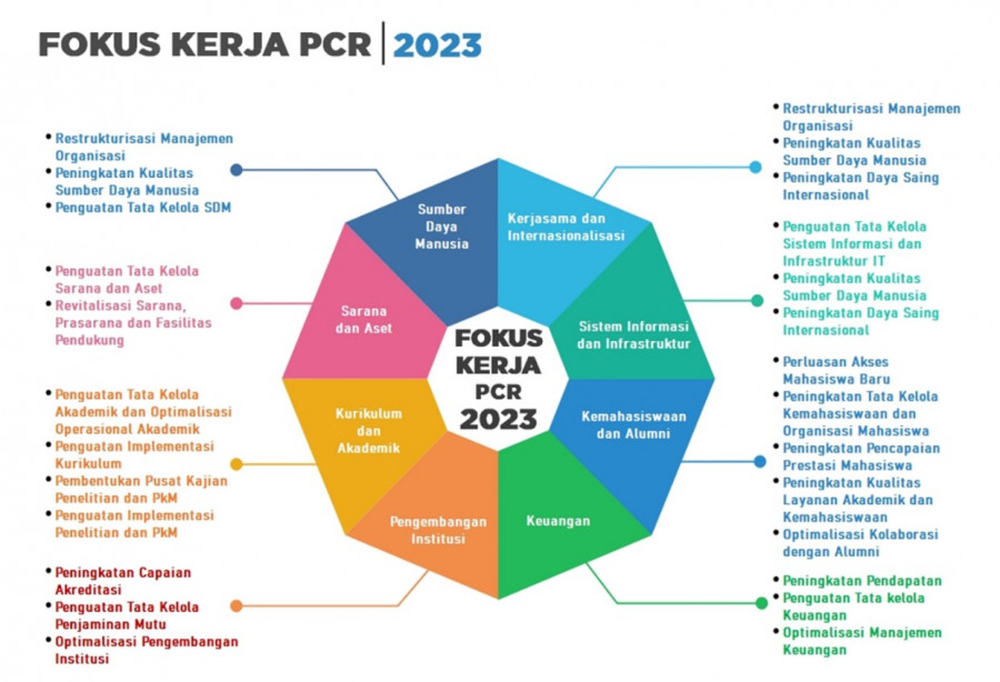 Setiap tahunnya Politeknik Caltex Riau melakukan Rapat Kerja dan Rapat Koordinasi yang bertujuan untuk Menyusun Anggaran dan Program Kerja serta melakukan SInkronisasi pelaksanaan program yang akan dilakukan. Ada 8 Fokus kerja yang menjadi panduan dalam penyusunan Program Kerja setiap Bidang dan Unit yang ada di PCR sehingga setiap Bidang dan unit dapat menentapkan Fokus kerjanya masing-masing. Berikut 8 Fokus kerja PCR tahun 2023 :