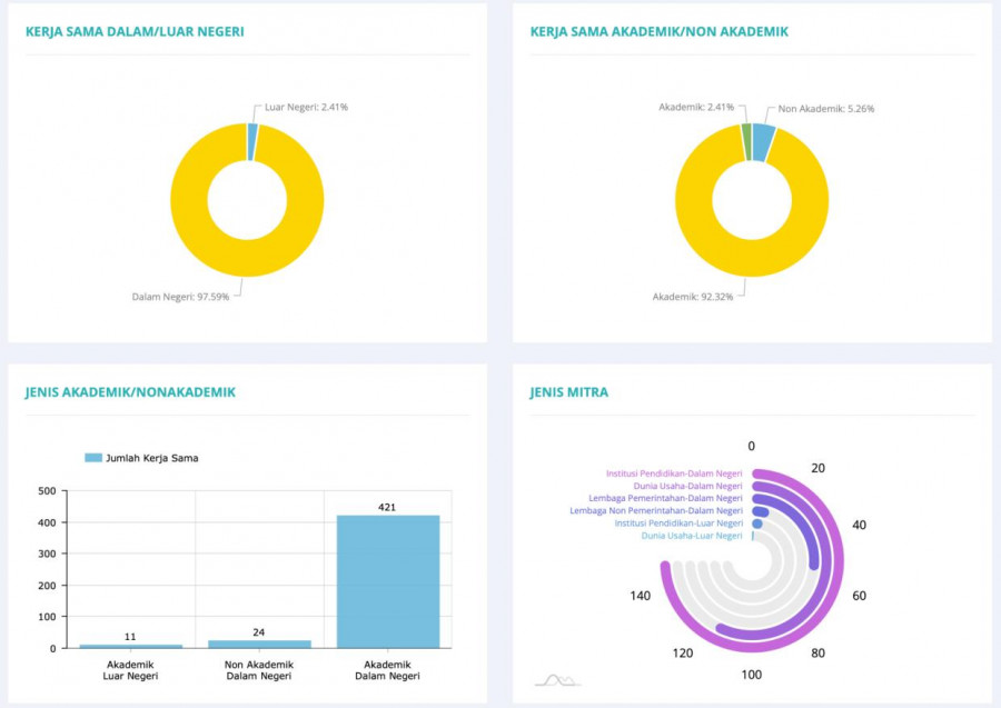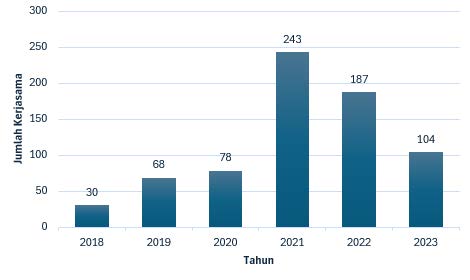 Selama tahun 2024, pengelolaan kerja sama di Politeknik Caltex Riau menunjukkan peningkatan jumlah mitra, khususnya pada kerja sama dalam negeri dan sektor akademik. Total kerja sama yang tercatat didominasi oleh kerja sama dalam negeri sebesar 97,59%, sementara kerja sama luar negeri masih berada pada angka 2,41%. Dari sisi jenis kerja sama, sebanyak 92,32% merupakan kerja sama akademik, dengan proporsi kerja sama non-akademik sebesar 5,26% dan akademik luar negeri sebesar 2,41%. Hal ini mengindikasikan bahwa kegiatan kerja sama selama periode pelaporan masih berfokus pada penguatan sektor pendidikan tinggi dalam negeri, yang mendukung pelaksanaan tridarma perguruan tinggi.