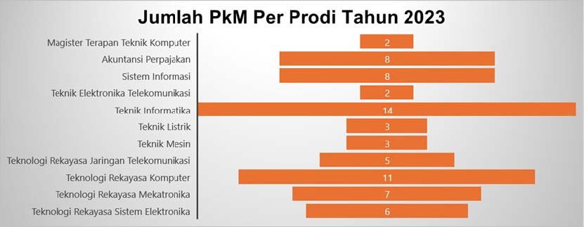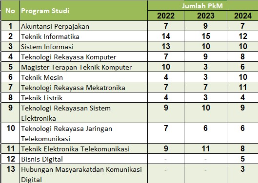Sama halnya dengan proses penelitian, proses pengelolaan PkM Dosen PCR hingga saat ini dilakukan dengan bantuan BP2M Management System (https://bp2m.pcr.ac.id). Seluruh mekanisme proses hingga pelaksanaan PkM mulai dari pengusulan proposal, penilaian awal, monitoring dan evaluasi (monev) hingga pelaporan dan penilaian akhir terdata pada sistem ini. Sumber dana dari pelaksanaan kegiatan PkM tahun 2024 berasal dari berbagai perolehan jenis hibah, yaitu: internal, KEMDIKBUD-RISTEK, dan hibah Kerjasama. Berikut merupakan sebaran jumlah kegiatan PkM per Program Studi tahun 2022 – 2024.