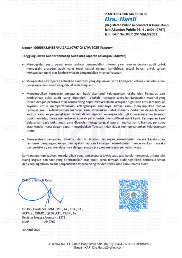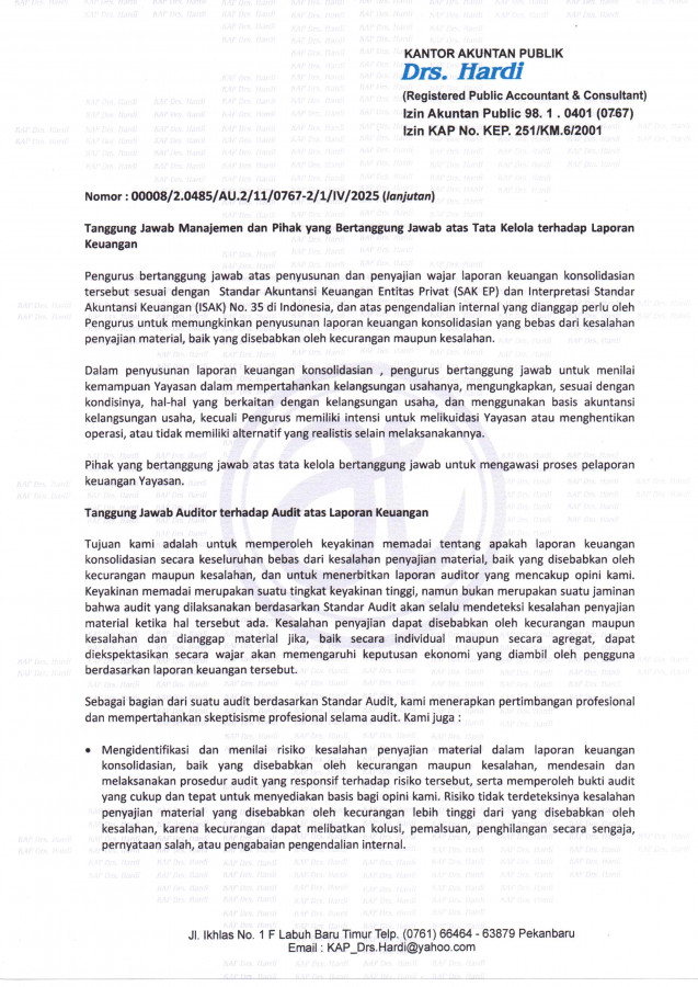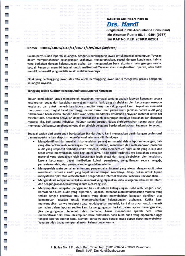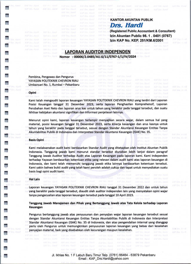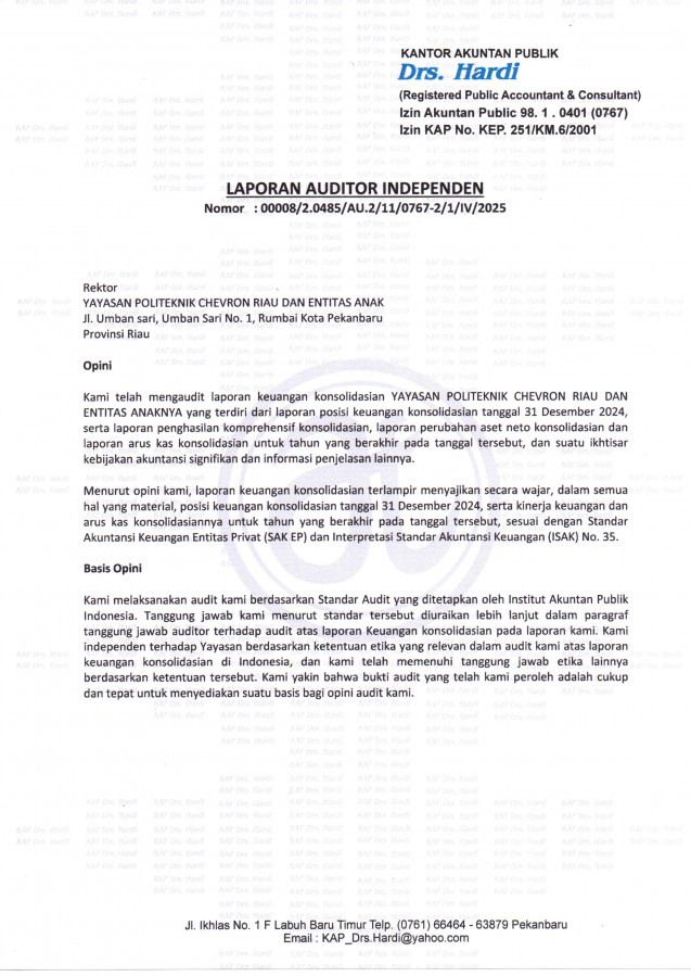 Berikut merupakan Laporan Keuangan Konsolidasi Yayasan Politeknik Chevron Riau yang dilakukan oleh Kantor Akuntan Publik.