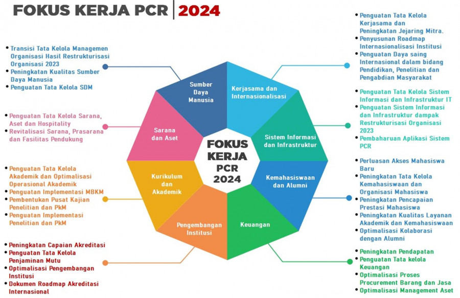 Program kerja PCR di tahun 2024 diselaraskan dengan program-program yang terdapat dalam Rencana Strategis (Renstra) PCR tahun 2022-2026, Rencana Pengembangan Jangka Panjang (RPJP) 2017-2031, serta hasil analisis terhadap faktor internal dan eksternal PCR. Secara umum kinerja PCR pada tahun 2024 sudah sangat baik yang didasarkan pada tercapainya program kerja dan indikator kinerja yang telah ditentukan. Namun demikian beberapa program/indikator kinerja belum terlaksana atau perlu perbaikan pada masa yang akan datang. Dari banyak pencapaian yang diraih pada tahun 2024, pencapaian yang paling membanggakan adalah tetap terjaganya peningkatan kepercayaan dari masyarakat, khususnya orang tua untuk melanjutkan pendidikan putra-putrinya di PCR.