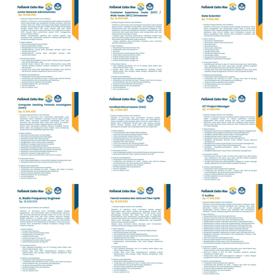 | 4 | Junior Network Administrator | 6 hari (5 hari pelatihan + 1 hari sertifikasi) | Luring | Nama Lembaga Pelatihan: Politeknik Caltex Riau Nomor SK: Masa Berlaku: - Metode Penyelenggaraan: Luring Tempat Pelatihan: Politeknik Catex Riau Tempat Ujian Kompetensi: Politeknik Caltex Riau |
