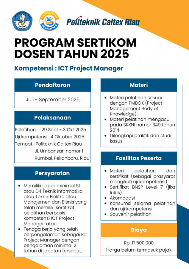 | 6 | ICT Project Manager | 7 hari (6 hari pelatihan + 1 hari sertifikasi) | Luring | Nama Lembaga Pelatihan: Politeknik Caltex Riau Nomor SK: Masa Berlaku: - Metode Penyelenggaraan: Luring Tempat Pelatihan: Politeknik Catex Riau Tempat Ujian Kompetensi: Politeknik Caltex Riau |